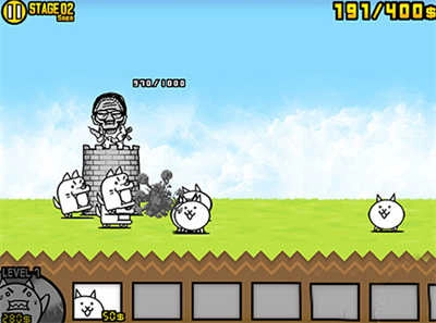 3.点击BATTLE!!之后就进入游戏了,游戏界面如下,那个奇怪的柱状物就是我们的老家了,我们的任务就是守护老家。那些汪星人就是我们的敌人,我们需要做的就是等右上角的钱数增长以后开启左下角的按钮让塔里的猫咪能力更强或者生产喵星人。游戏初期可以选择的喵星人兵种很少,只有这一种,后期会有很多不同类型的喵星人,而敌人的类型也会增多,小蛇大猩猩神马的应有尽有。如果敌人直接压到我方塔下我们的塔的生命就会减少,到零的时候就会GAMEOVER。