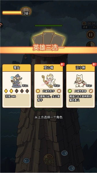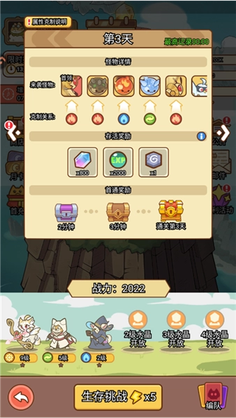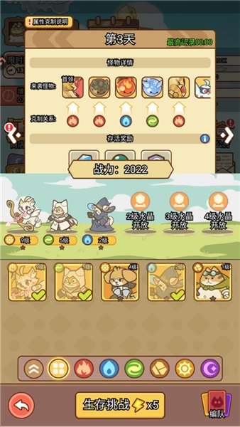 2、策略布阵,开启塔防新篇:这绝非普通的传统塔防!您得依据关卡的独特特性,精巧搭配具备不同属性与技能的喵咪,借助它们彼此间的属性羁绊,构建出威力惊人、毁天灭地的连锁技能。