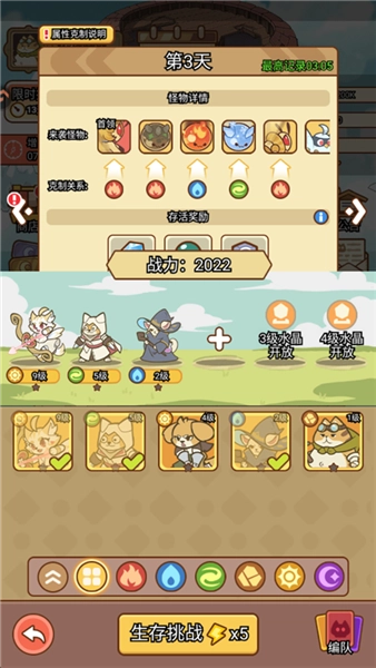 1. 点击“生存挑战”,在此处你能够查看当前天数所对应的敌人以及 BOSS 之间的克制关系。