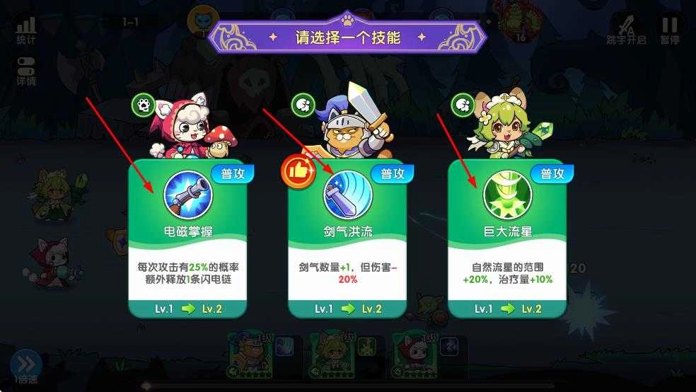 1. 技能挑选着重看效果。电磁掌握凭借概率触发闪电链;剑气洪流增加使用次数但降低单次伤害;巨大流星扩大技能作用范围并附加治疗效果。大家可按需选择。