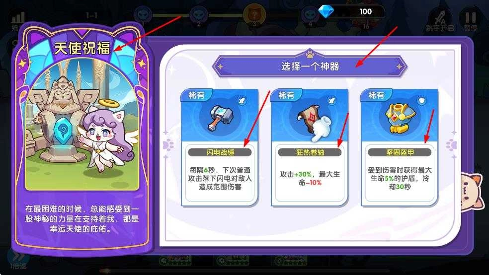 3、神器选择结合需求,缺范围伤害选闪电战锤,追求高攻选狂热卷轴,脆皮选坚固盔甲保生存。