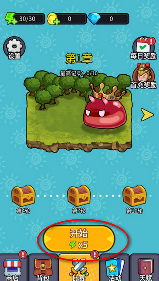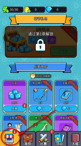 2、过完教程后会进入到这个界面,左下角的商店可以购买钻石,礼包,信物碎片等。