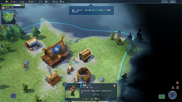 5、选择好部落后进入游戏,左上角是你当前的物资,点击右下角可以在你的区域内建造各种建筑,包括伐木场、训练营等等。