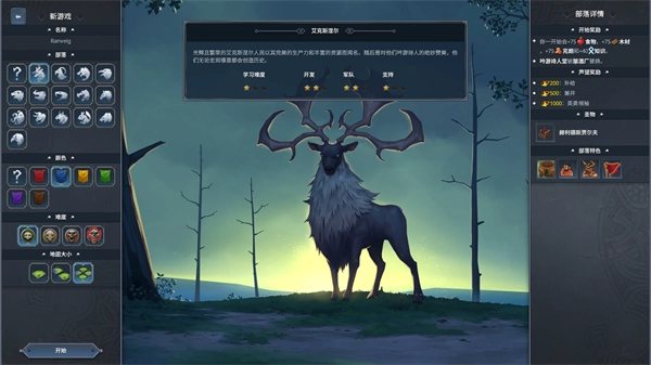 4、选择单人模式,点击新游戏进入,玩家将进入部落选择界面,在这里你可以自由更换喜欢的部落,并且调整游戏难度、地图大小,同时上方还会显示部落的玩法难度、开发难度、军队强度等等评级,让玩家可以更好地了解每一个部落的优缺点,右侧还会显示各种属性以及增益。