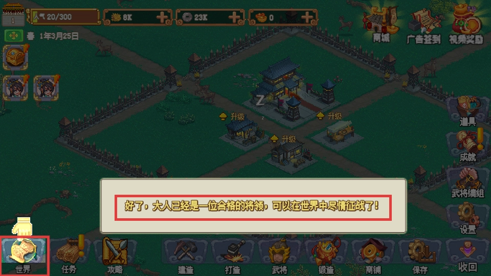 1. 轻点【世界】,开启征战之旅。凭借前期建设所取得的成果,于乱世之中踏上冒险发展的征程,以积极的征战行动来壮大自身势力。