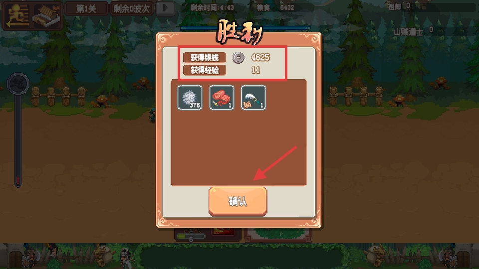 4、战斗胜利后,查看【4625】铜钱、【11】经验等,点击【确认】领奖励,积累资源再战。