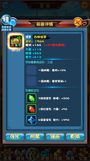最后,有一处必须着重提一下!《挂机吧兄弟》里存在“全身强化”这一概念。当玩家全身装备穿戴齐全,且每件装备均经过强化后,装备属性会获得加成!加成幅度与强化等级挂钩。在此特意提醒各位不太机灵的玩家:装备务必全部强化!