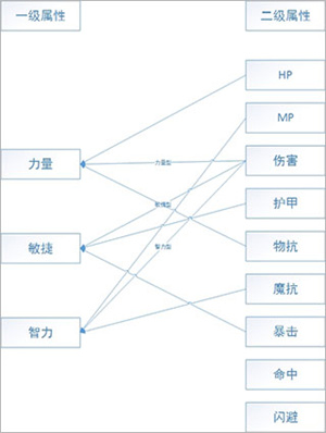 如图所示,主公的一级属性为力量、敏捷、智力。对应的,力量影响HP,力量型主公(曹操)的伤害,以及物抗;敏捷影响护甲,敏捷型主公(孙权)的伤害,以及暴击;智力影响MP,智力型主公(刘备)的伤害,以及魔抗。而命中和闪避需要通过装备来提升