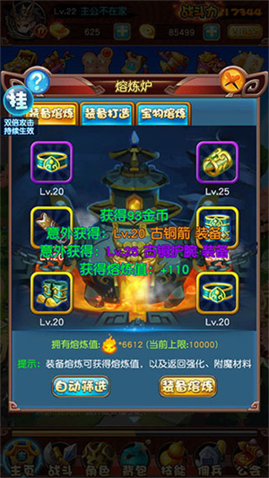 熔炼值可以用来打造装备,可以打造出比同等级、同品质属性更高的装备,最低也是紫装。终于,不用充钱也能搞到好装备了……要注意的是,打造出来的装备等级是和玩家当前的挂机副本等级相关的。所以,骚年,先去把副本推平了吧!